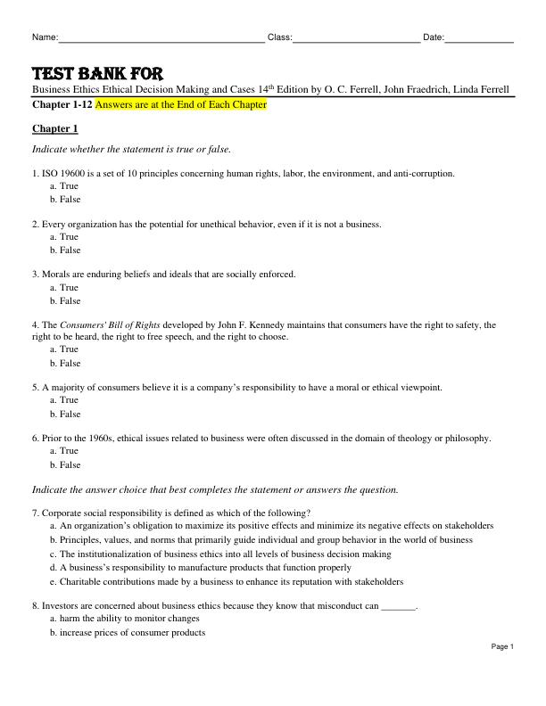 Test Bank For Business Ethics Ethical Decision Making and Cases 14th Edition by O. C. Ferrell, John Fraedrich, Linda Ferrell Chapter 1-12